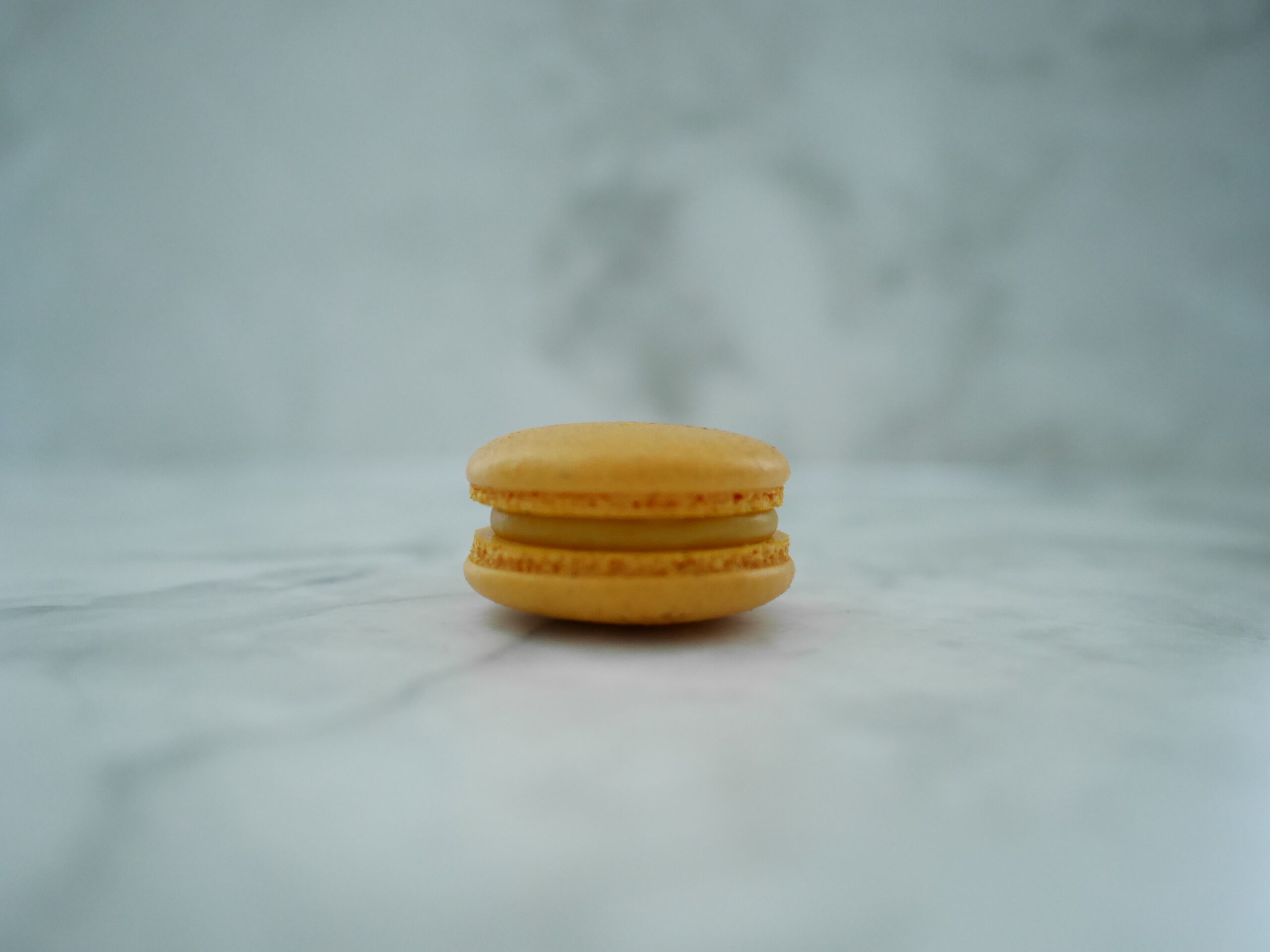Macaron met een mango passievruchten ganache. Allergenen: lactose, noten, ei