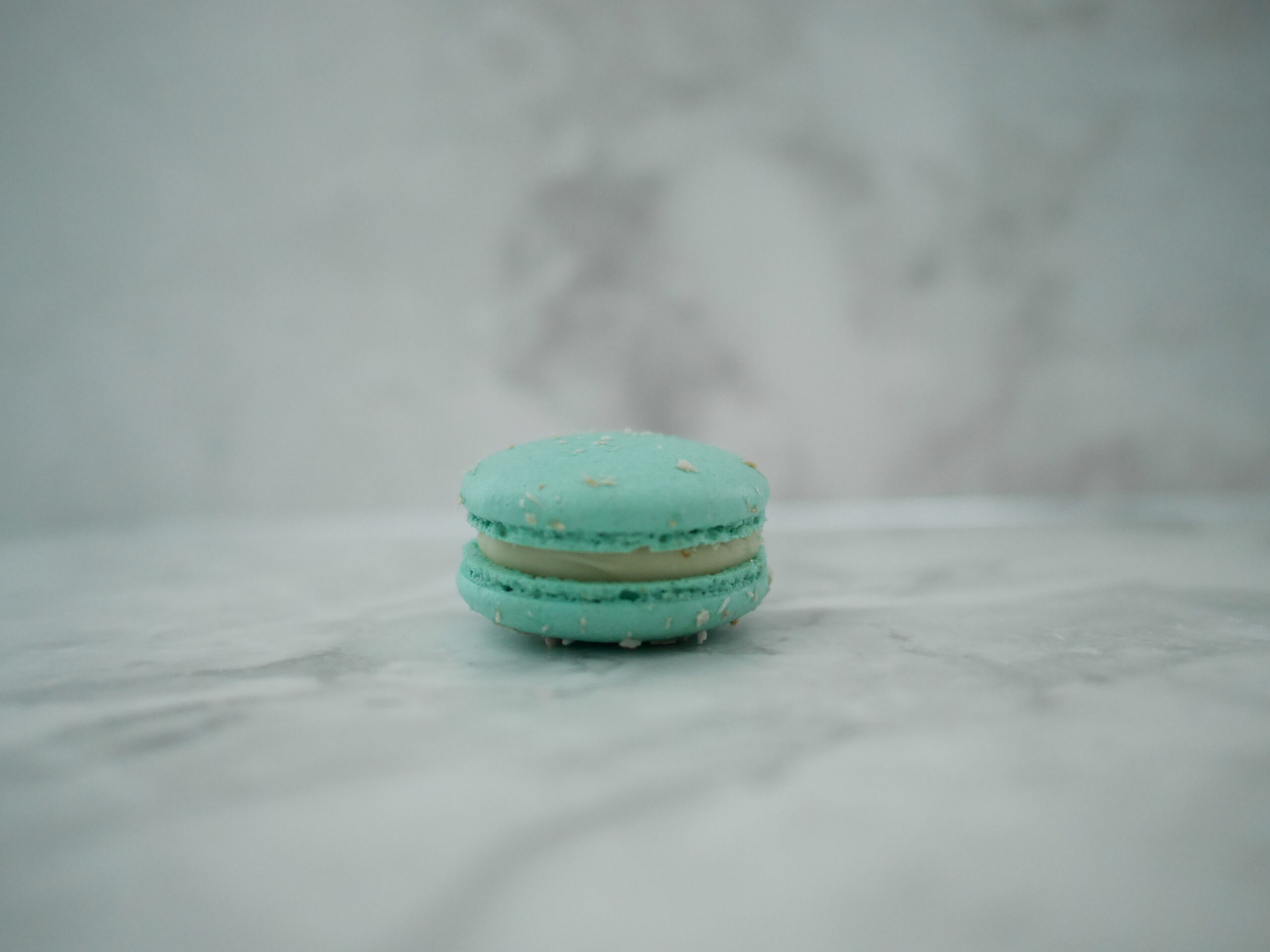 Macaron met een kokos limoen ganache met geroosterde kokos. Allergenen: lactose, noten, ei